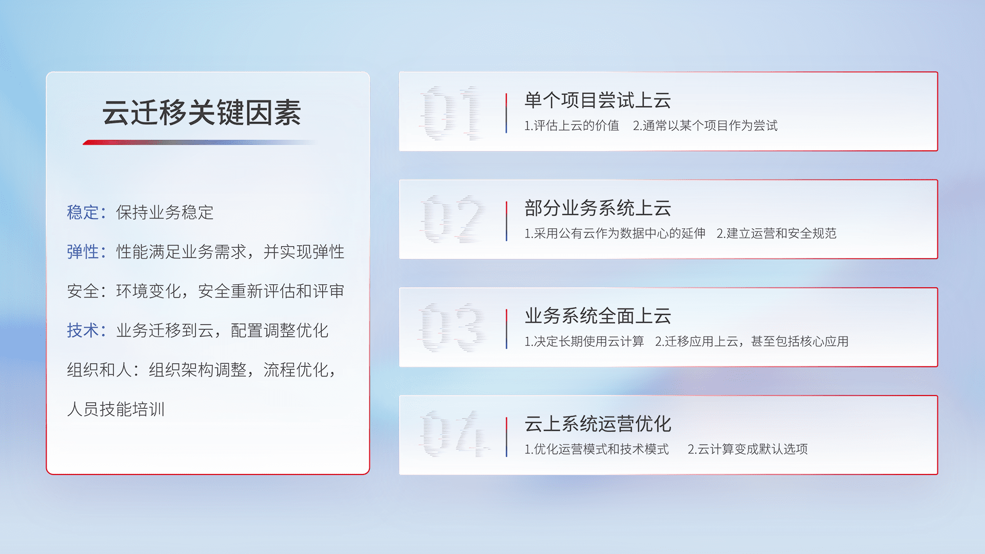结合实际业务,,从规划设计、、云平台选型、、云原生改造、、数据迁移、、、集成交付,,,,迁移全过程为客户识别最佳上云路径,,,做好风险识别管理,,设计网络架构、、、身份权限、、安全审计合规、、、、操作审计、、、、日志审计、、监控告警策略、、、、多站点容灾设计等,,对云上基础设施进行整体规划,,,提升IT治理水平,,以满足弹性、、、高可用、、、、高性能的需求。。。